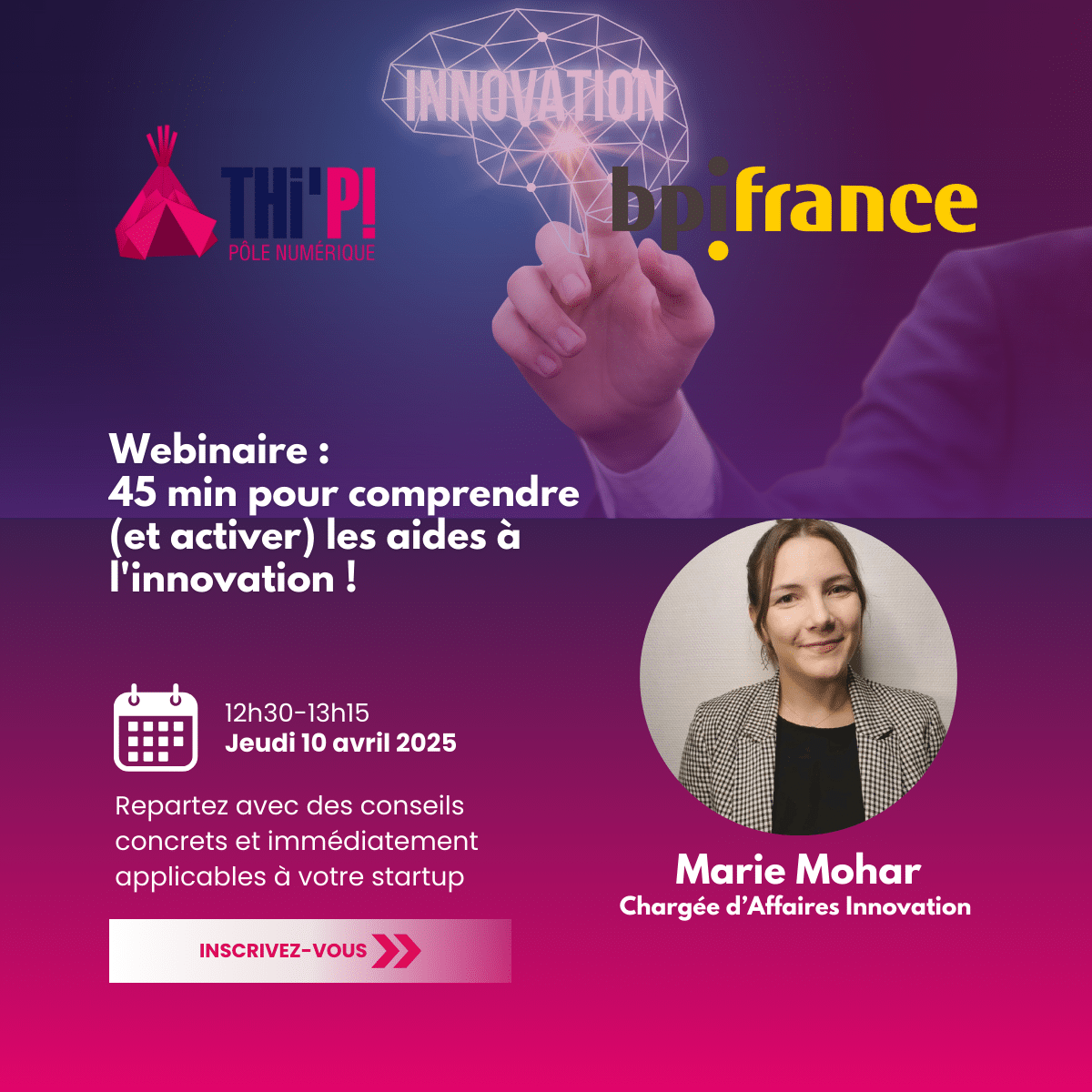 Le Thi’Pi accueille Marie Mohar, Chargée d’Affaires Innovation chez Bpifrance, pour un webinaire exclusif sur les dispositifs de financement à l’innovation.