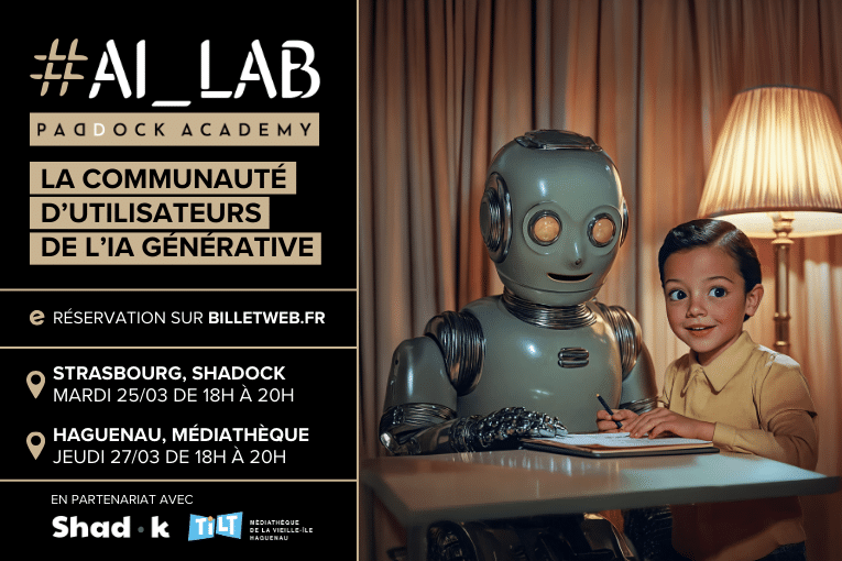 L’AI_LAB, une initiative de Paddock Academy, en partenariat avec le Shadok Strasbourg, qui propose des ateliers mensuels participatifs et des points d’actualité pour vous aider à développer vos compétences