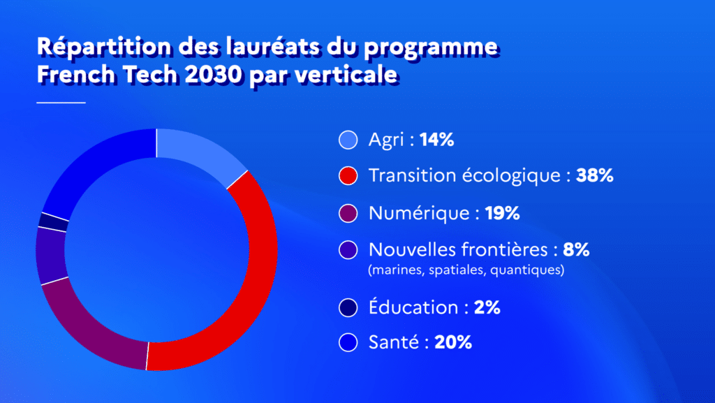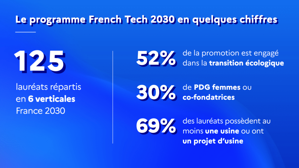 En 2023, et pour le programme French Tech 2030, ce sont 125 startups lauréates qui ont été sélectionnées, réparties en 6 verticales (Agri, Transition écologique, Numérique, Nouvelles frontières, Éducation, Santé). Parmi ces 125 startups, 52% de la promotion est engagée dans la transition écologique, 30% des jeunes pousses ont à leur tête ou en tant que co-fondatrices des femmes, et 69% des lauréats possèdent au moins une usine ou un projet d’usine.